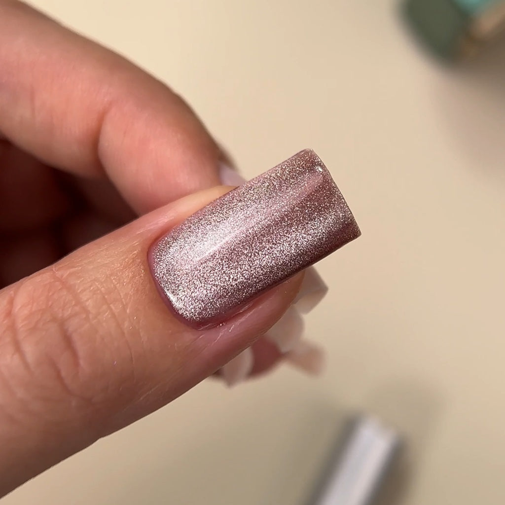Після проведення магнітом по лаку ви отримаєте сріблястий відблиск з м'яким ліловим відтінком. Рекомендуємо придбати HEYLOVE Gel Polish Mirage для швидкого, яскравого блиску. Після полімеризації можна завершити манікюр топовим покриттям або продовжити дизайн.