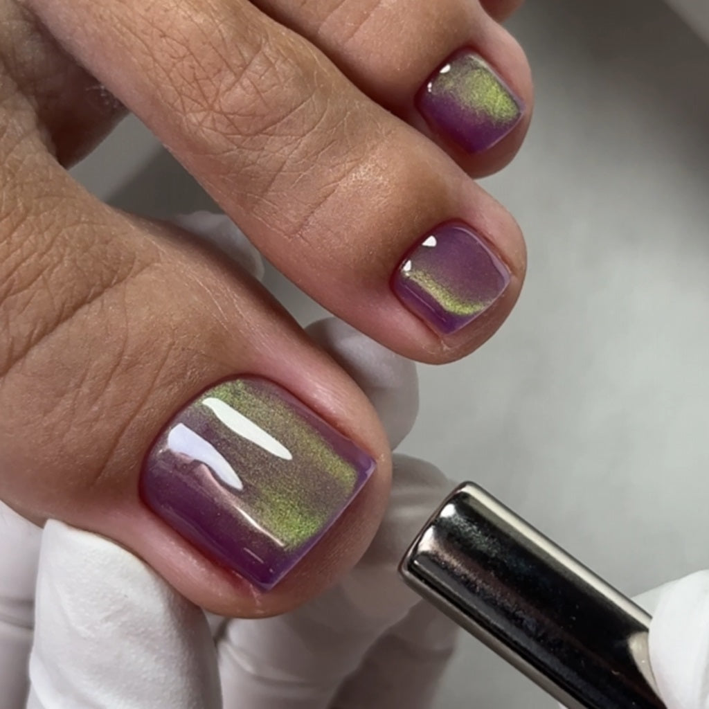 Гель-лак Saga Smoothie Cat Cat Eye наповнений дрібними металевими частинками. Під впливом магніту вони змінюють положення, створюючи відблиск. Магніт можна розташовувати під різними кутами, щоб створювати прямі лінії, вигнуті промені, абстрактні візерунки або плавні переходи між двома відтінками.